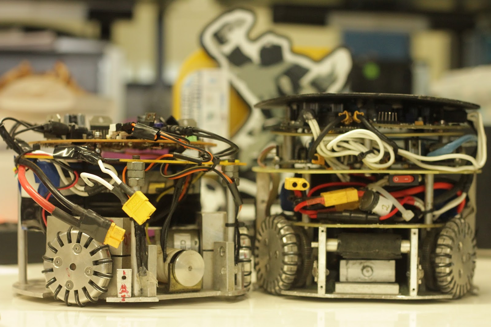 | Categoria tamanho pequeno (F180): à esquerda, o robô na versão dos calouros; à direita, a versão dos veteranos, que é mais complexa |